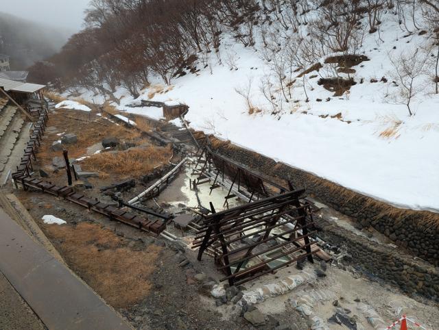 This morning at Takayu Onsen, the sky is clear but snow is flying. The temperature is 5.5°C and a strong wind is blowing.