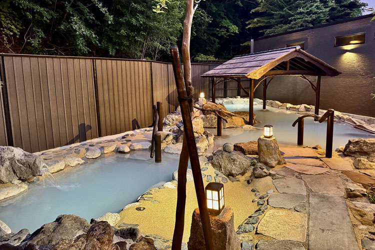 趣ある大浴場内湯と、広々とした貸切露天風呂「薬師一の湯」「薬師二の湯」、コンパクトな貸切内湯「ひめさゆり」と様々温泉をお楽しみいただけます。